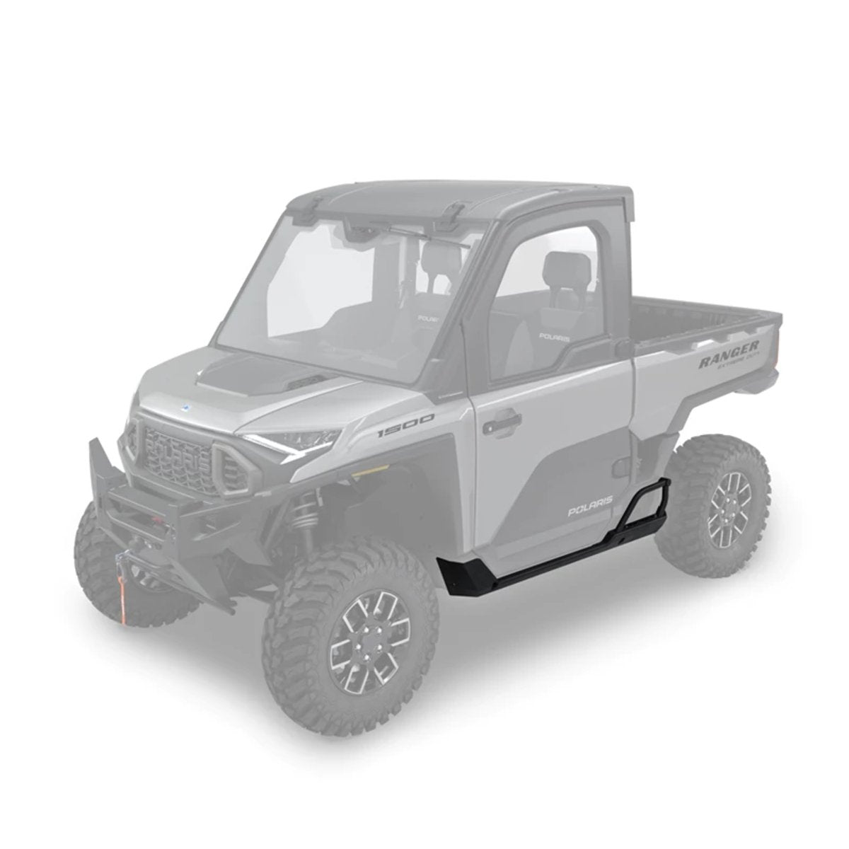 Increase the side protection of your side-by-side with this reliable, hard-working Rock Guard. The sturdy, steel construction includes a black e-coat and a durable, black powder-coated finish. With the added step, easily get into the vehicle, and remove mud from footwear with an integrated boot scraper to reduce tracking on the interior. Easily installs with integrated mounting locations directly on the frame, instead of underneath, for maximum ground clearance.