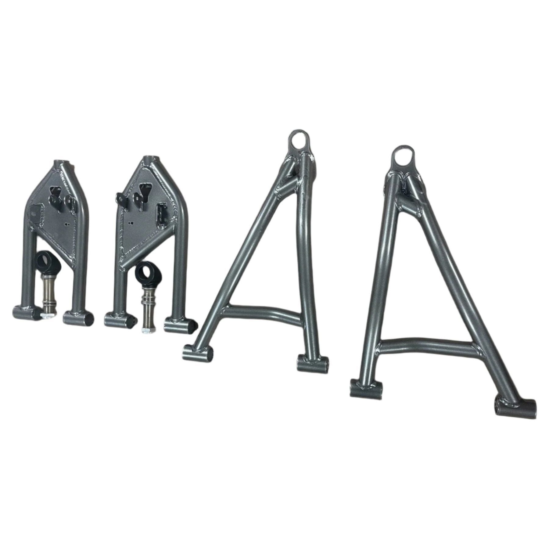 This set of Front A-Arms have adjustable uppers. The adjustment is in the uppers only, the lowers are direct bolt. These A-Arms are 1.75″ Forward. The adjustable pins have a 1 inch diameter. These are only offered raw or powder coated black.