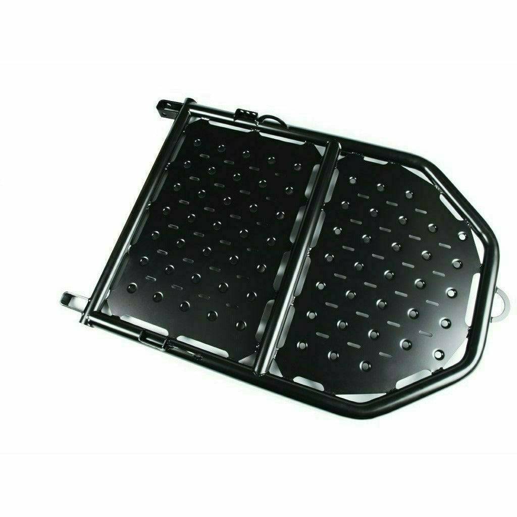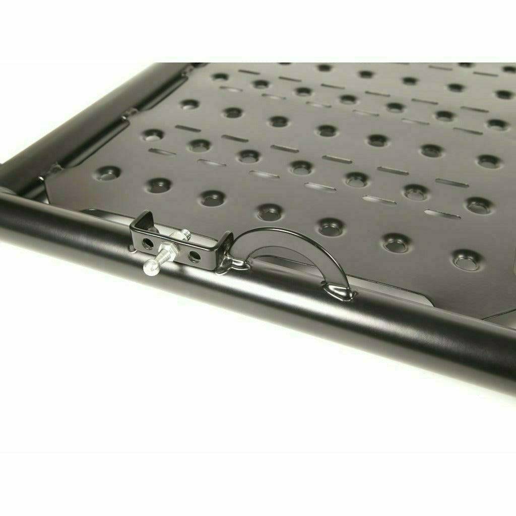 The main platform is much wider with dimpled and slotted utility plates welded in to provide a flat plain for storage on the top or bottom. For added stability, 2 hinge pivots were added where the rack mounts to the cage. For greater adjustability, there are 3 mounting options for the new shorter EZ lift gas shocks and latch strikers. Latch brackets mount directly to the rear cage bolts. Placing the latches at this position offers more bed clearance while also making it so no part of the Adventure Rack touches the body of the vehicle. The overall installed appearance is much cleaner than the previous design.