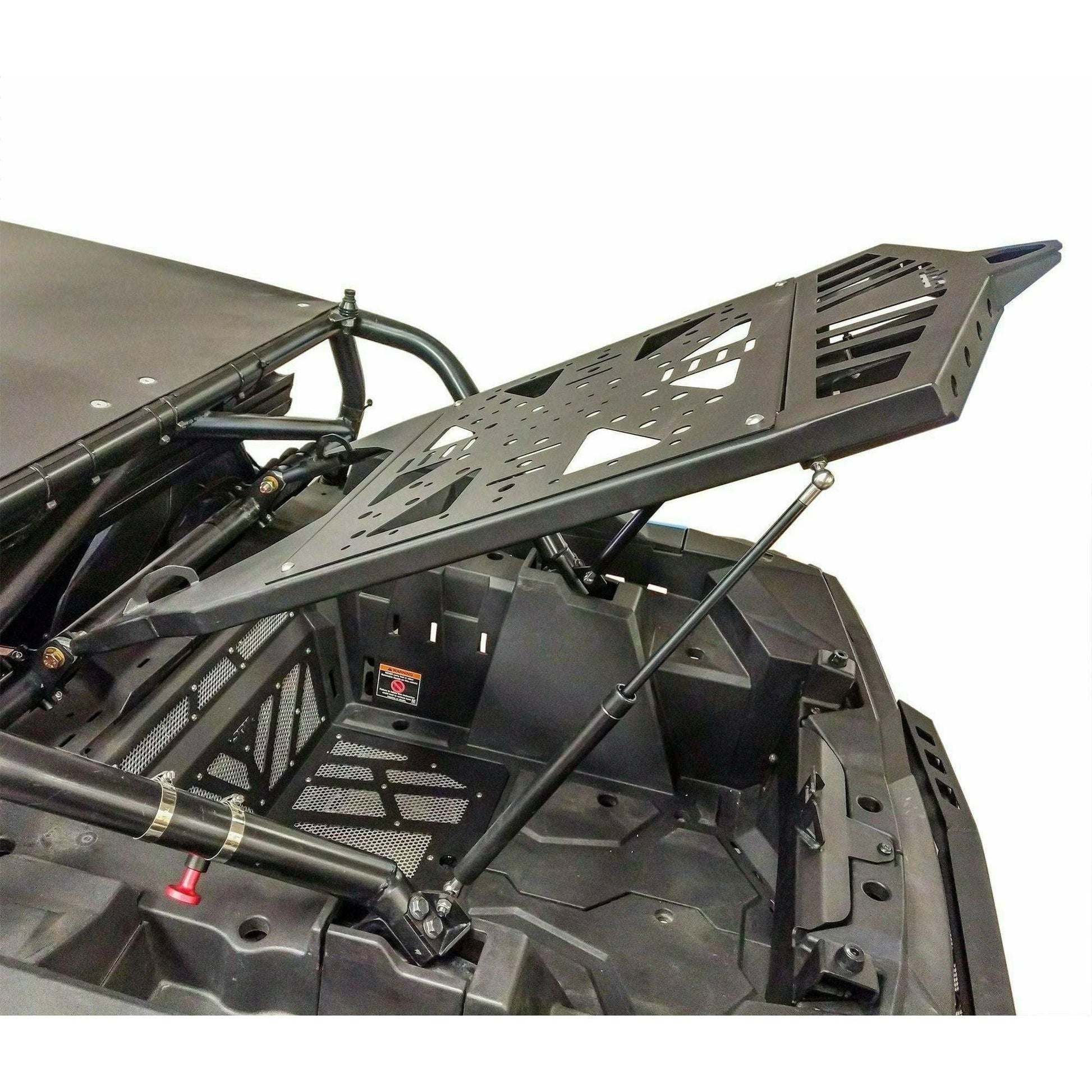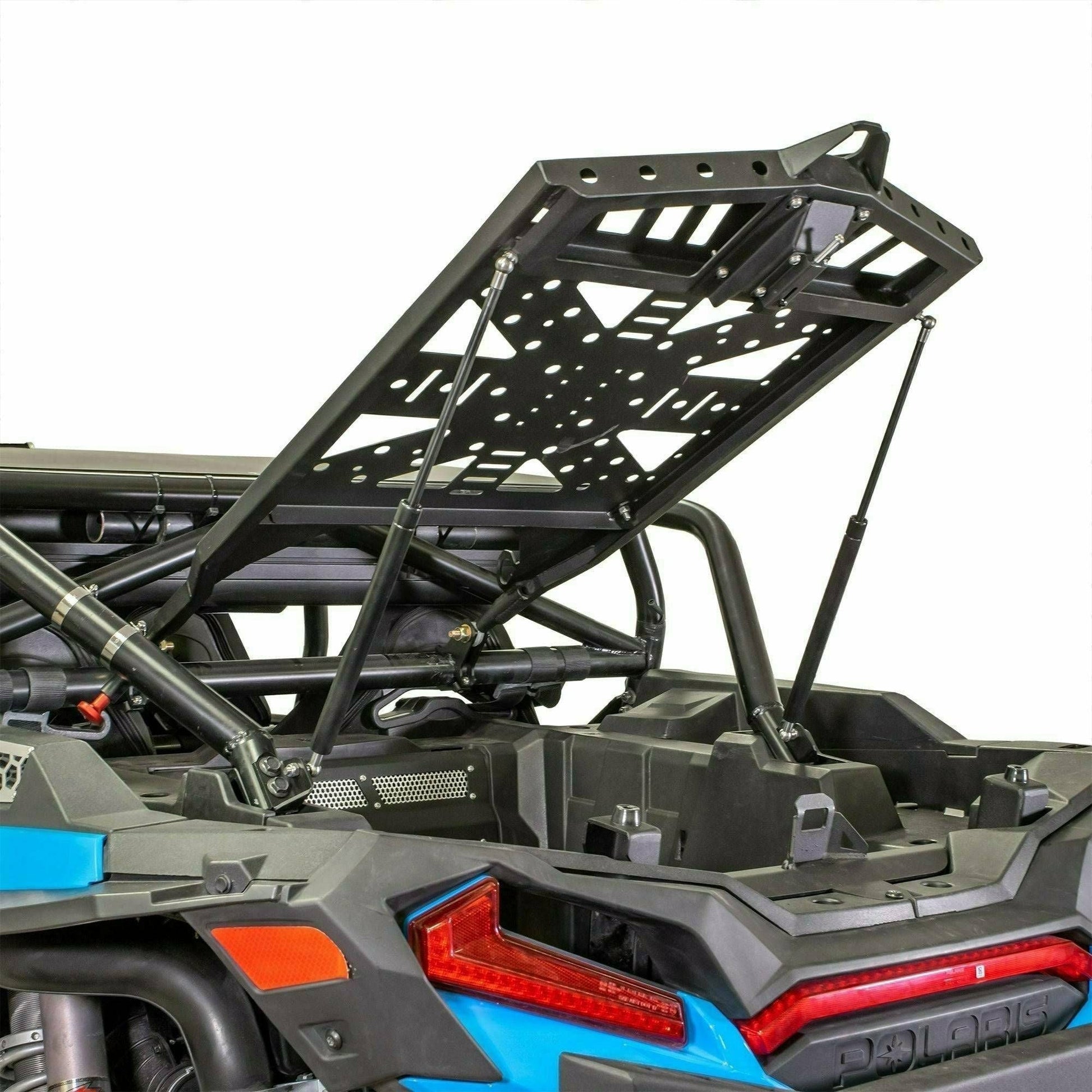 The DRT Motorsports Polaris 2014+ RZR XP 1000 / XP Turbo / Turbo S Adventure Rack and Tire Carrier is an essential upgrade for every RZR XP rider. The RZRXPTC1 features a boxed design with tons of tie-down point options, a heavy-duty latch, and lift assist shocks. When used as a tire carrier, the DRT RZR XP Adventure Rack will hold up to a 35î tire securely to keep you on the trails and running hard. The DRT XP adventure rack comes powder coated in DRTís signature sand black finish with high-grade hardware and completely bolt-on installation.