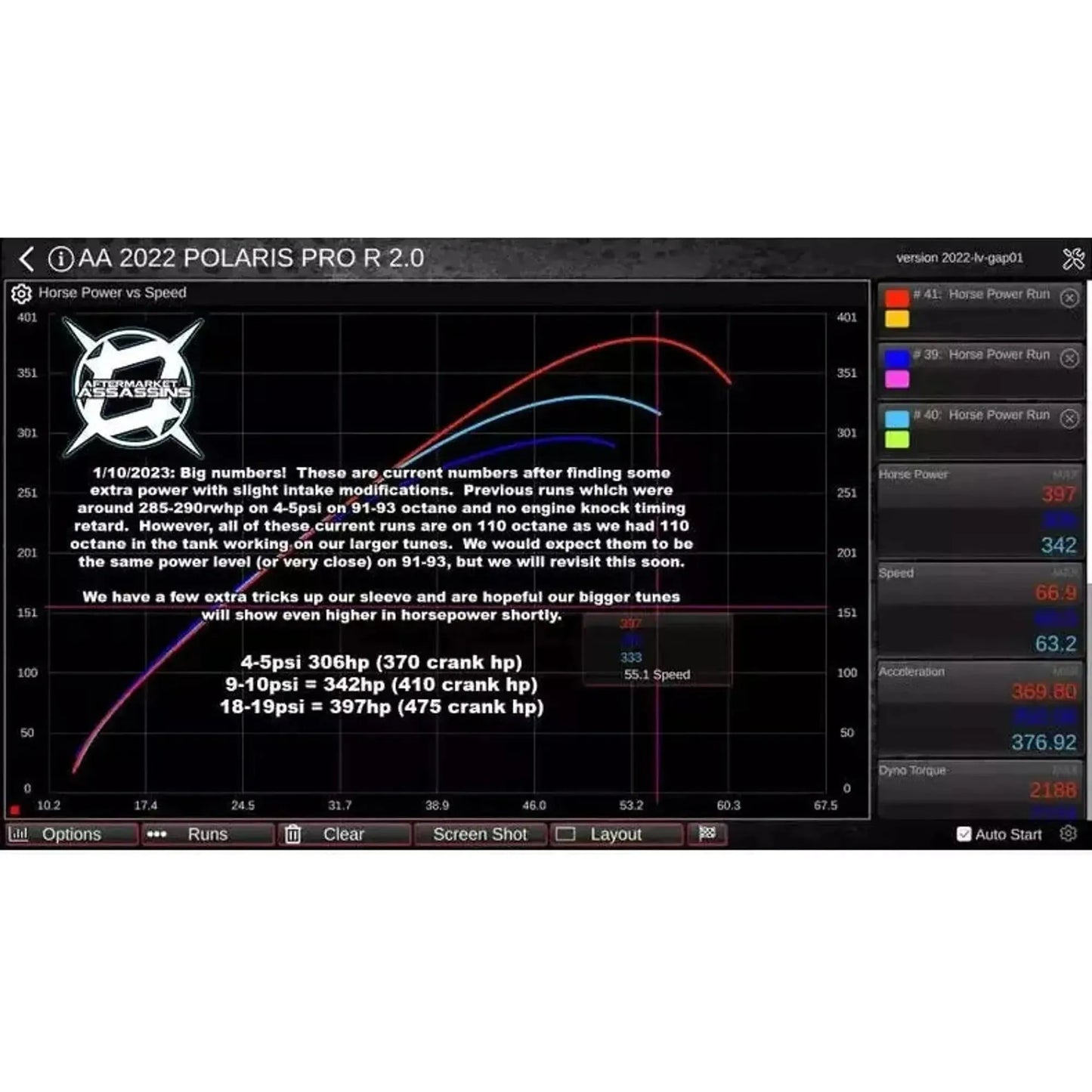 We are also in development of race tunes to run 18-20psi of boost. We have hit 411rwhp on our dyno at this pressure, so roughly 475-500 crank horsepower. However running this high of pressure/cylinder pressure will take some extra testing to make sure all components of the motor, clutches, air intake, and venting can keep up.