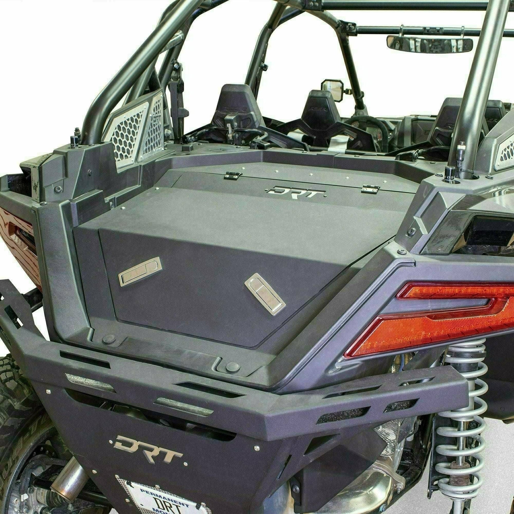 The DRT Motorsports Aluminum Storage/Trunk Enclosure is a must for riders who want to carry cargo more securely. The DRT Rear Storage Enclosure has a ceiling height of 10.5” and maintains the full width and length of the factory storage box. The RZRPROTE1 was designed with a .090 thick load-bearing lid for the capability to carry additional cargo on top of the enclosure lid when needed. The DRT Pro XP rear bed enclosure is perfect for riders who want to storage their tool bags, soft coolers, and other off-road essentials securely while riding in any terrain.