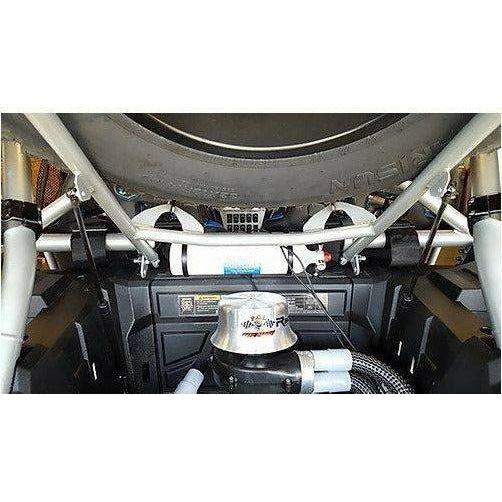 Madigan Motorsports Spare Tire Rack for the Polaris RZR XP 1000 and XP 4 1000 fits 2014+ up. Our laser-cut steel brackets are welded to our rigid 1018 steel frame, Tire Rack. The Spare Tire Rack is easy to install and can fit up to a 32" tire. It also does not mess with the rear view mirror visibility. It includes all the hardware to install the tire rack, a speed strap to strap the tire in and lift assist gas shocks to enable you to lift and lower the tire rack with no effort so you can get stuff out of the rear deck. Available in Raw or Black. Contact us for custom powder coating colors to match your RZR. Please allow 2-3 weeks for custom colors.