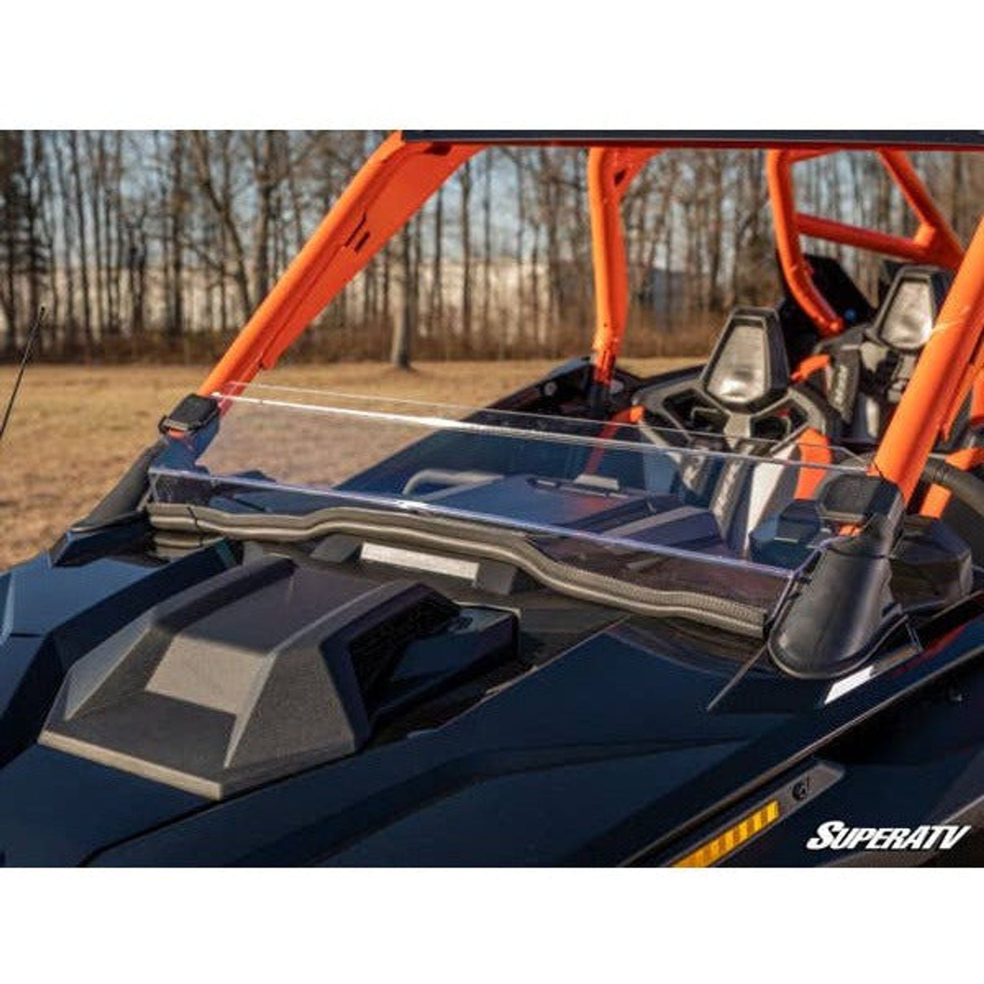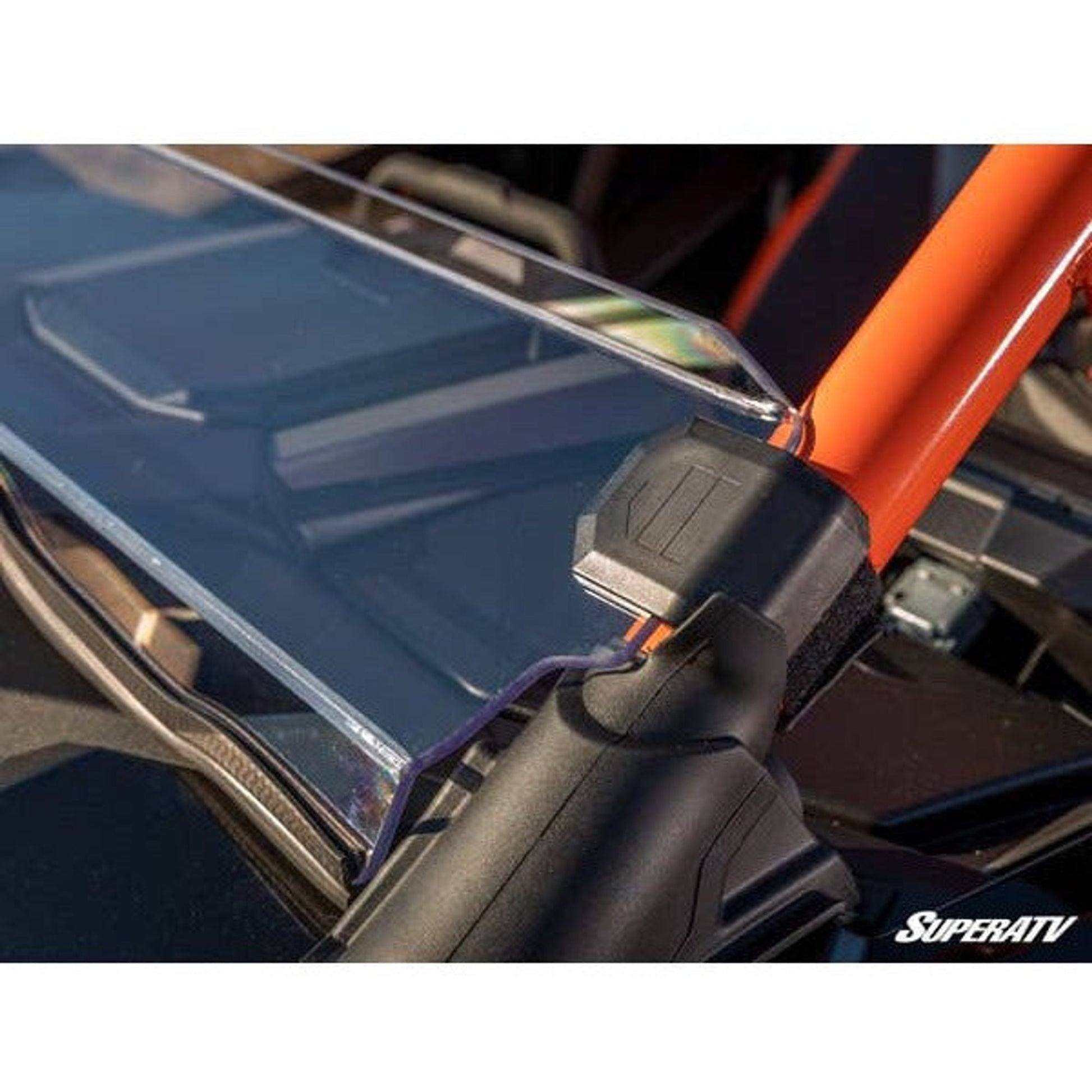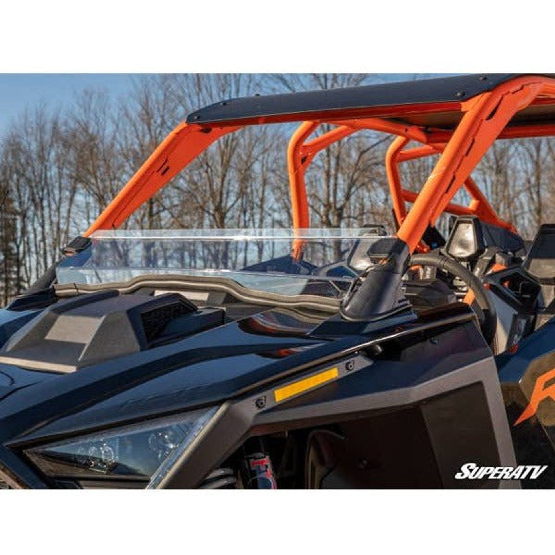 Kick unwanted wind, dust, and bugs to the curb by putting a SuperATV Half Windshield on your Polaris RZR Turbo R. It has a forward-facing lip at the top that diverts air up and over your head, cutting back your airflow without totally cutting it off. This UTV windshield sits at the perfect height—tall enough to protect your face from windburn, but not so tall as to impede your view.