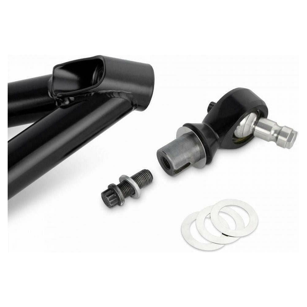 Typical adjustable control arms use a threaded rod end which doesn't offer fine camber adjustment. Cognito has engineered an ingenious solution that uses a bolt-on uniball rod end which is shim-able for fine camber tuning. Simply unbolt the rod end from the control arm and add or remove the supplied shims to get your desired camber angle.