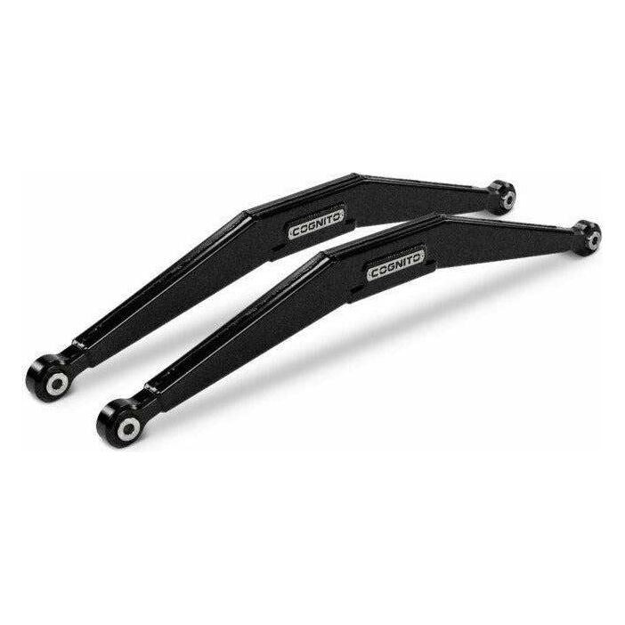 The Cognito Long Travel Front Control Arm Kit for the Polaris RS1 is the starting point for putting together any serious long travel suspension setup. This kit increases the trackwidth by 4-inches per side and offers 20-inches of front wheel travel. The upper arms have a robust boxed sheet metal design which increases strength while keeping weight to a minimum. The lower arms are constructed from high-grade steel tubing. Featuring a heavy-duty high clearance design which allows for better ground clearance while maintaining superior strength. Typical adjustable control arms use a threaded rod end which doesn't offer fine camber adjustment. Cognito has engineered an ingenious solution that uses a bolt-on uniball rod end which is shim-able for fine camber tuning. Simply unbolt the rod end from the control arm and add or remove the supplied shims to get your desired camber angle. Both upper and lower arms have heavy duty pivot bushings and uniballs.