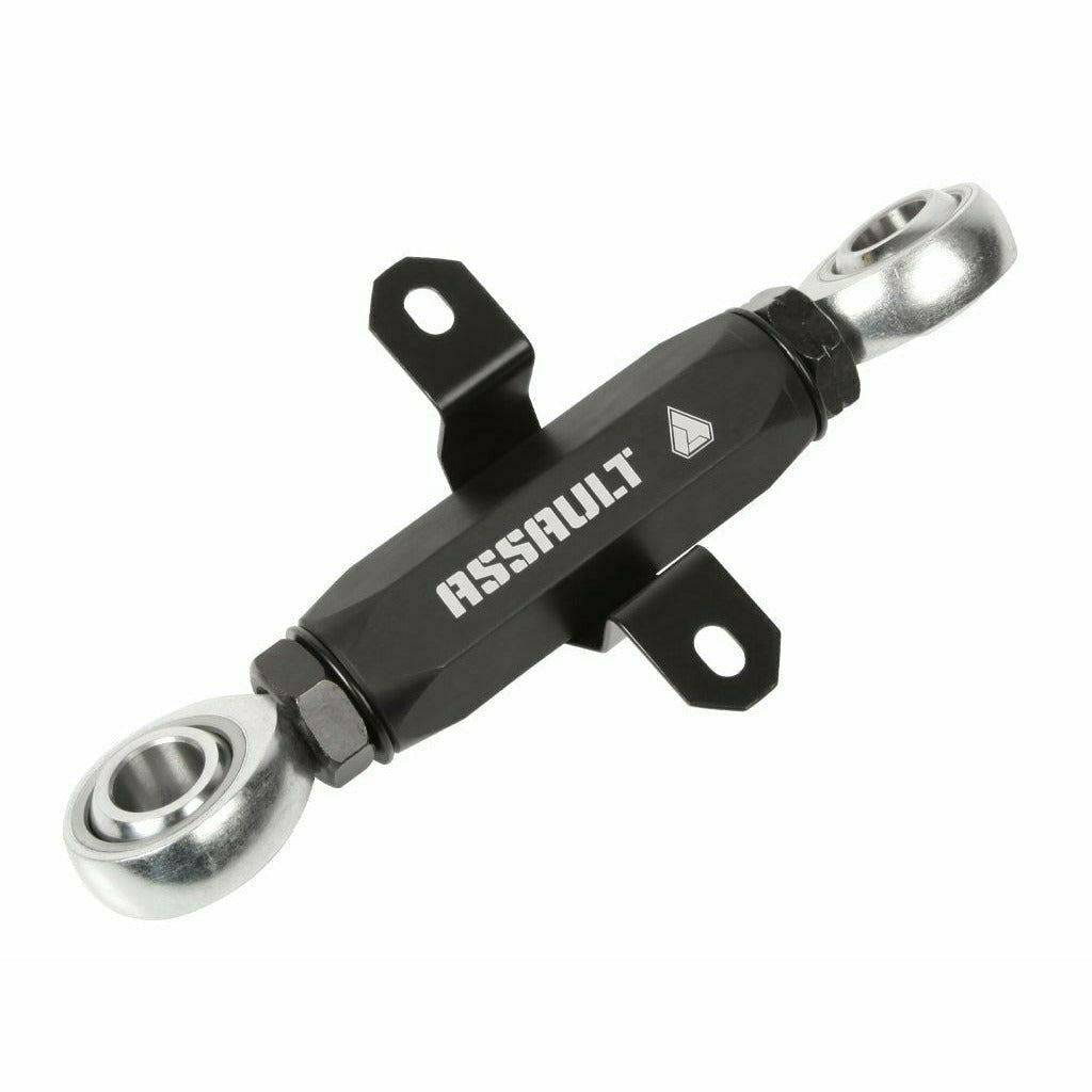 The center shaft is machined from 6061 T6 aircraft-grade aluminum and hard anodized black with laser engraved Assault Industries logos. Ultra rugged chromoly steel Heim joints offer a long lasting maintenance free connecting point between the trailing arm and sway bar. Integrated brackets allow you to install the OEM plastic shock guards.