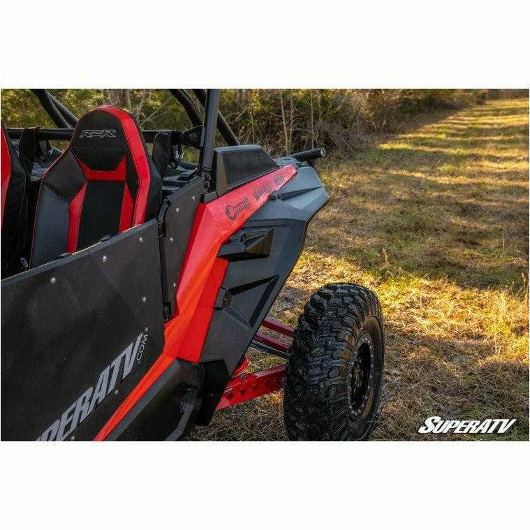 We built our extra-wide, extra-tough, SuperATV Fender Flares for Polaris RZR models to keep dirt on the ground. At 8.5” wide at their widest point and over 4” wider than stock, these fender flares do a better job of deflecting dirt and mud than your stock fender flares. The 3/16” thick HDPE construction means they have long-lasting strength and durability mile after mile. Plus, we know how to make them look good — they match the look of your machine and fit so well, your friends will swear they’re OEM fender flares!