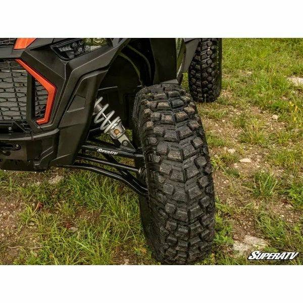 You want bigger tires to tackle bigger obstacles, but you don’t want a lift that’s hard to handle and makes you feel unstable. You need SuperATV’s High-Clearance 2” Forward Offset A-Arms for your Polaris RZR XP Turbo. They increase your wheel base by 2 inches, so you get more stability, room for up to 33” tires, and more strength than stock. It will make your ride better.