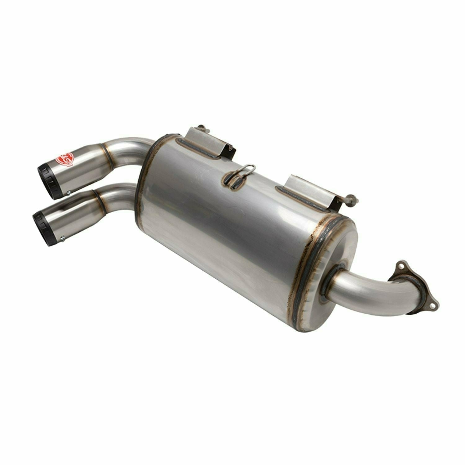 Welcome to the new world order of high-performance exhaust for the SxS space! High flow stainless muffler body is combined with dual exits, each containing a removable spark arrestor as well as tunable inserts. Both sound and power can be adjusted by changing the inserts. Wide-open on the trails? Put the 2.25" inserts in and let it breathe. Rock crawling in Low? Replace the inserts with 1.375" for maximum torque. Additional tuning inserts available as well. Use with or without factory rear cover and clears most aftermarket bumpers. Does not require ECU tuning.