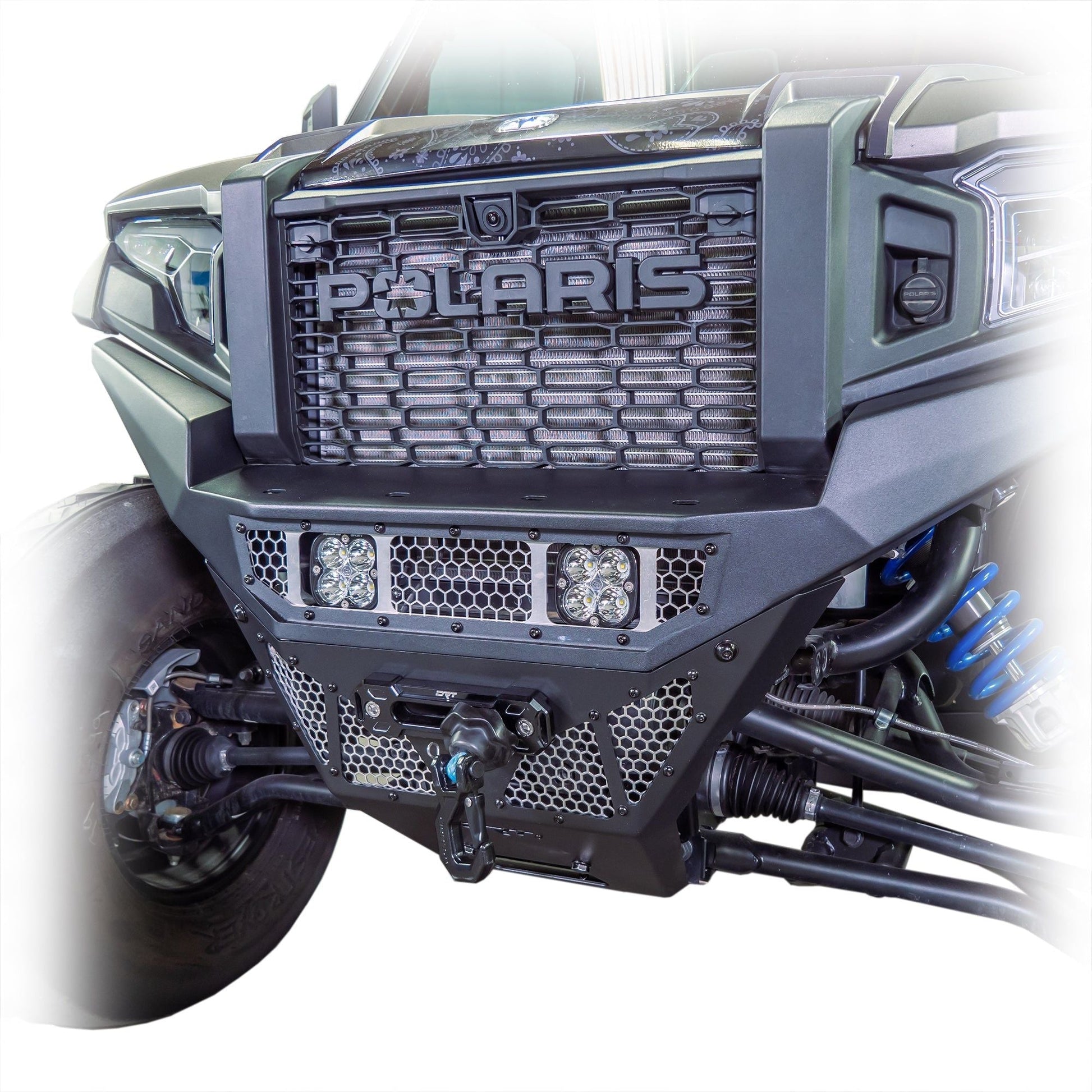 The DRT Xpedition front bumper is constructed from laser-cut steel that is formed and welded to provide the ultimate protection to your SXS. Like all DRT products, this bumper is easy to customize with removable laser-cut mesh inserts and logo plates. The DRT Motorsports Polaris XPEDITION Front Bumper is provided with two clear anodized laser-cut aluminum panels for the use of 3" pod lights or solid mesh in the center pocket area of the bumper.