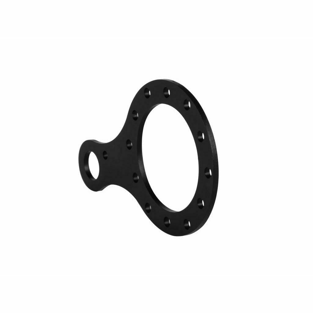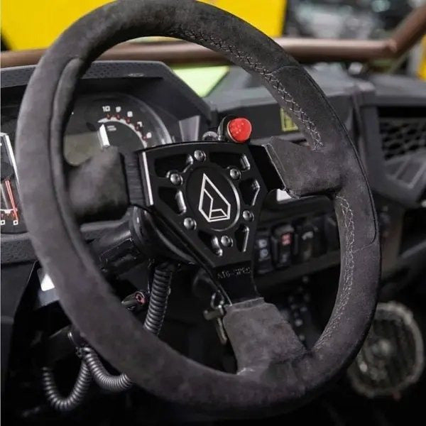 The Assault Industries steering wheel push-to-talk communications plate (PPT plate) installs between the steering wheel and hub/quick release. The PPT plate enables the use of a comm. radio push-to-talk button.