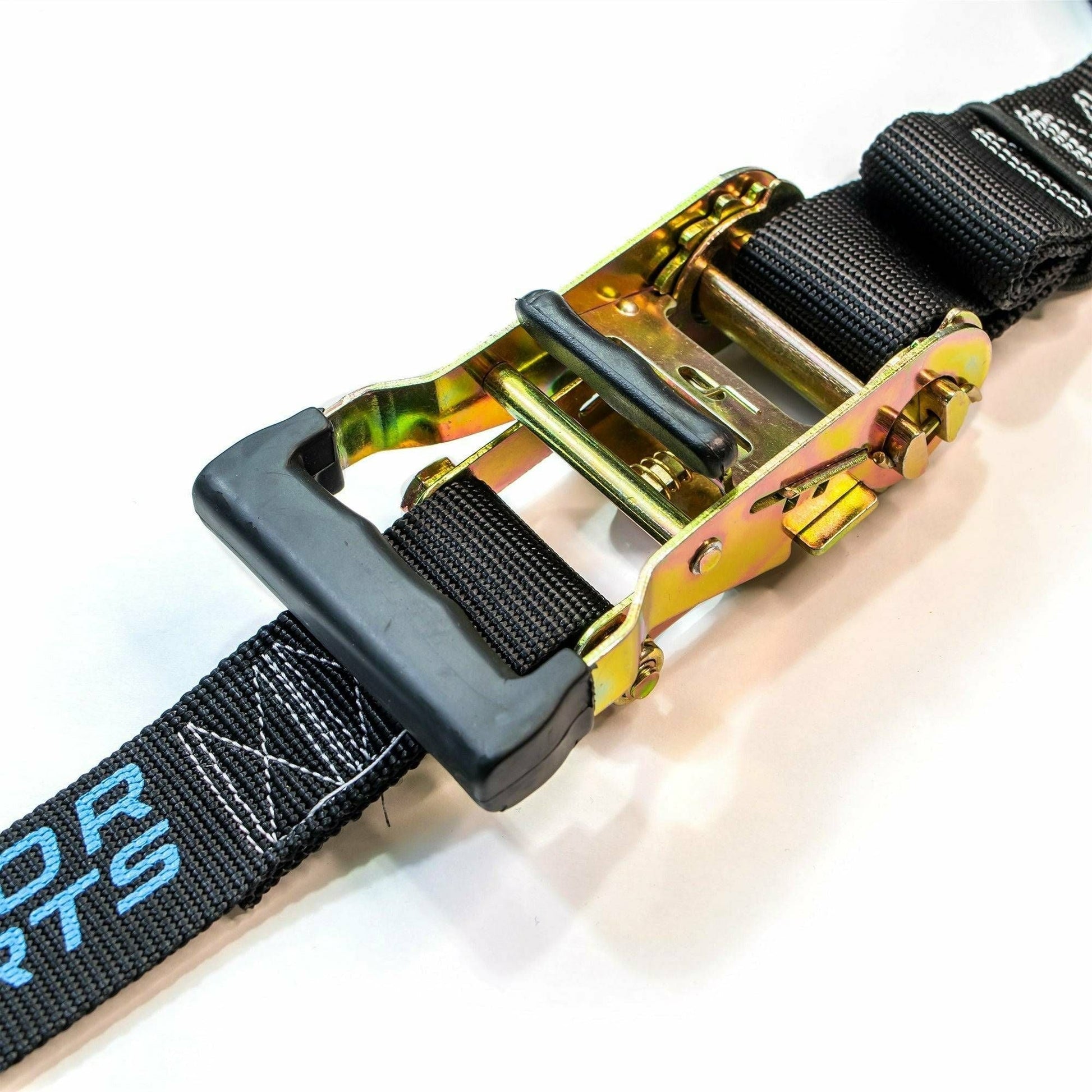 The DRT Motorsports Ratcheting (3-point) Y-Strap (UPC 10005TC01401) is Made in the USA and constructed of 1.50" high strength, low stretch, synthetic webbing. All steel components are zinc plated for long life and use in the harshest conditions. Adjustable for a large range of tires. Plasti-coated steel hooks protect surfaces and contact points from damaging finishes.