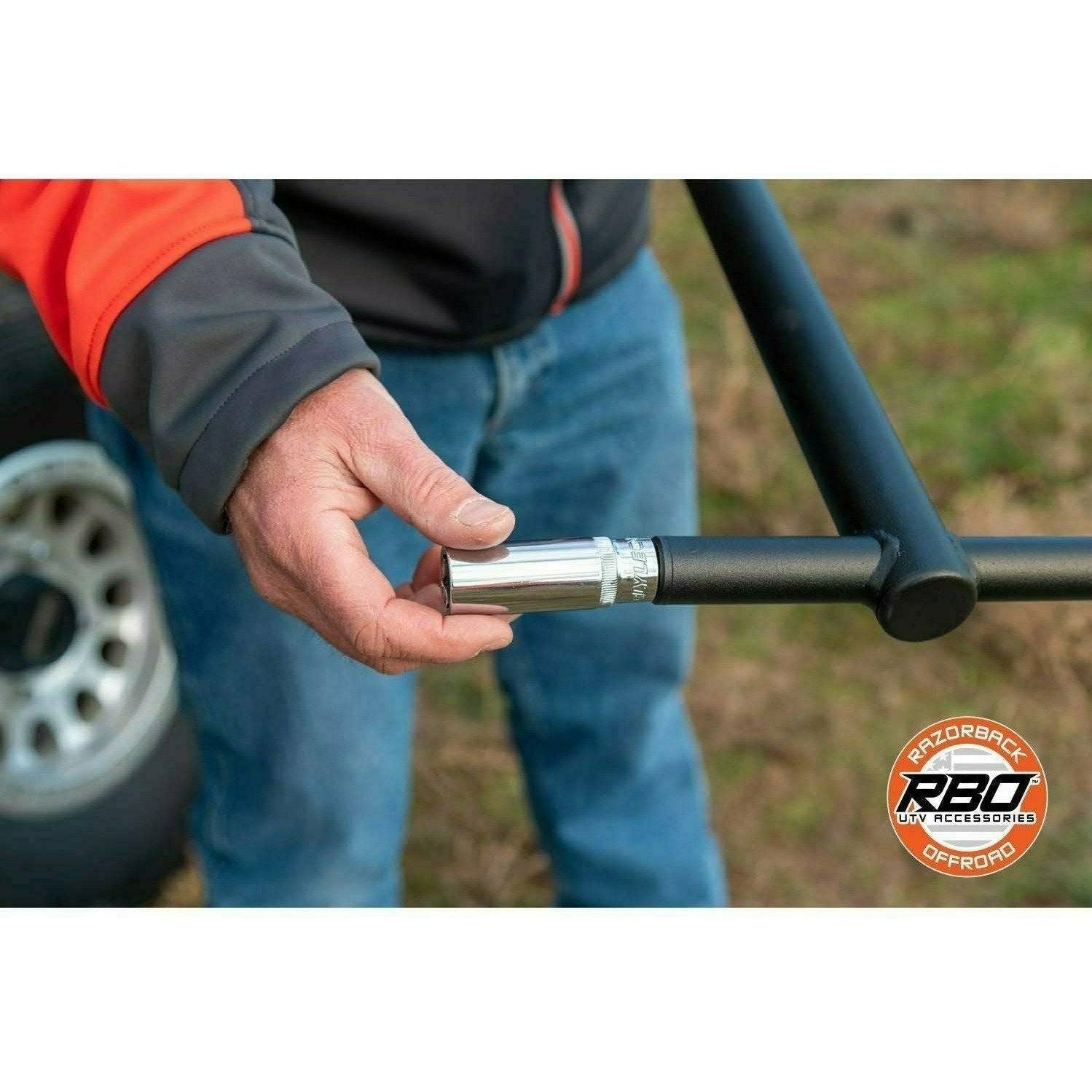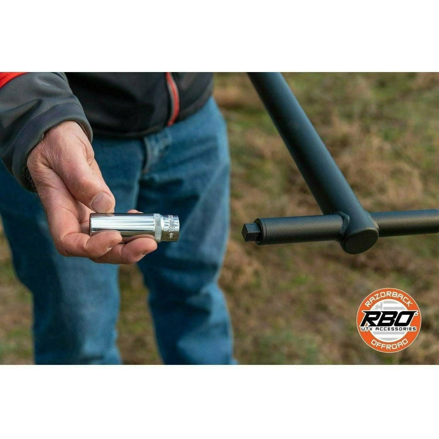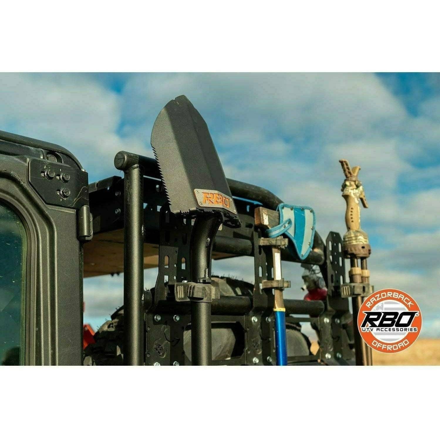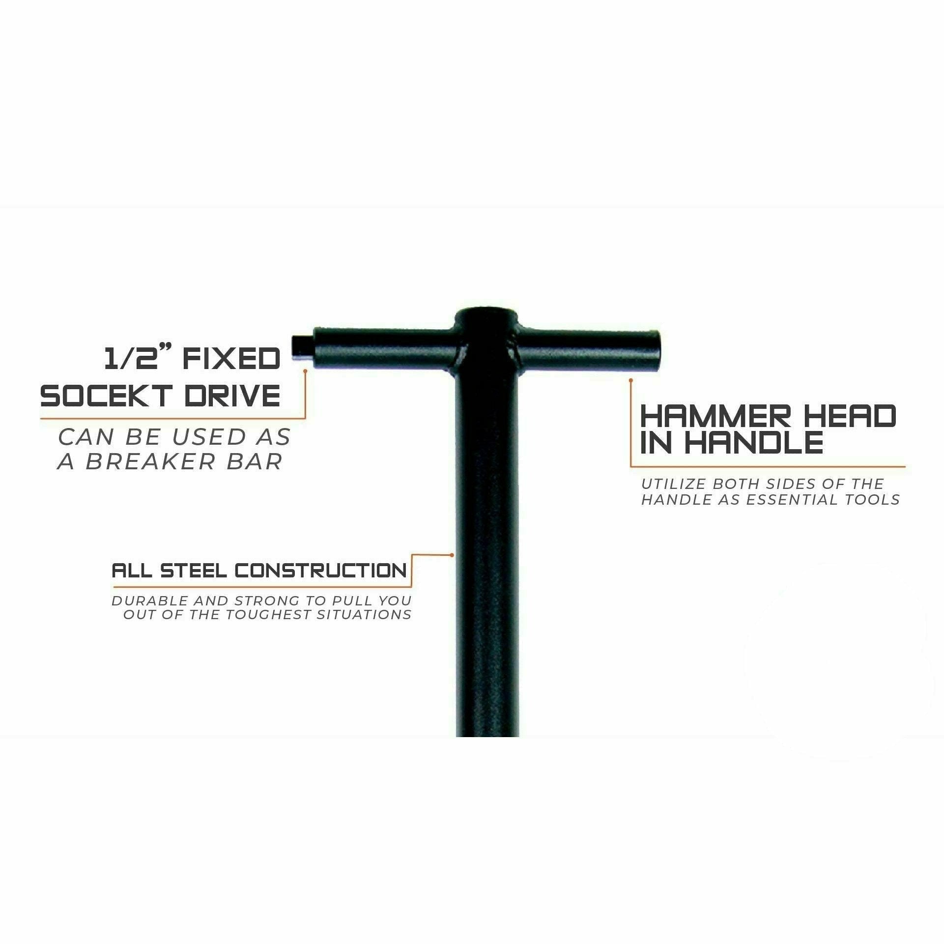 As a multi-use tool, the Offroad Recovery Shovel features a fixed ½” socket drive and a hammer head in the handle. Also, the spade features serrated edges and notches on the tip to help pull out tent stakes. The non-slip spade steps prevent your boots from slipping in the muddiest situations. This shovel is compatible with the “It Fits” Universal Tool Mount. Made with a durable steel construction and a powder coated matte black finish, the Offroad Recovery Shovel is built to last for generations. Proudly made in the USA and comes with our 30-day money back guarantee.