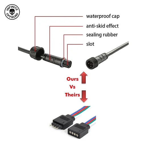 Our plug & play RGB+W whips can be added to your RGB+W rock light system or choose a dedicated controller with bluetooth & RF remote which allows dual control via app or hand held remote. Also allows red/brake and white/courtesy override turned on by a positive triggered wire. Screw style waterproof connections stay clean and connected.