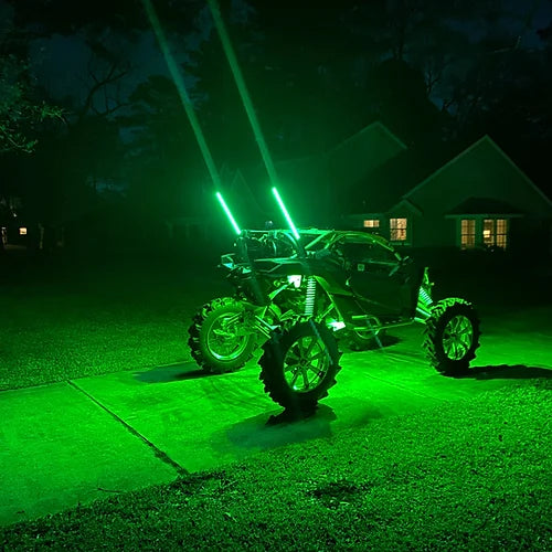 Our 2nd Gen whips are extremely bright and the toughtest on the market. We wrap our high density ultra-bright LED strand around an inner tube with no space allowing maximum LEDs per inch then encase. Then sealed in a high strength polycarbonate tube which gives twice the strength and protection. Check out the video showing them vs a 3lb sledge. This eliminates issues like moisture inside and broken LEDs from hitting trees, all very common with competitors shrink wrapped whips which are not fully sealed.