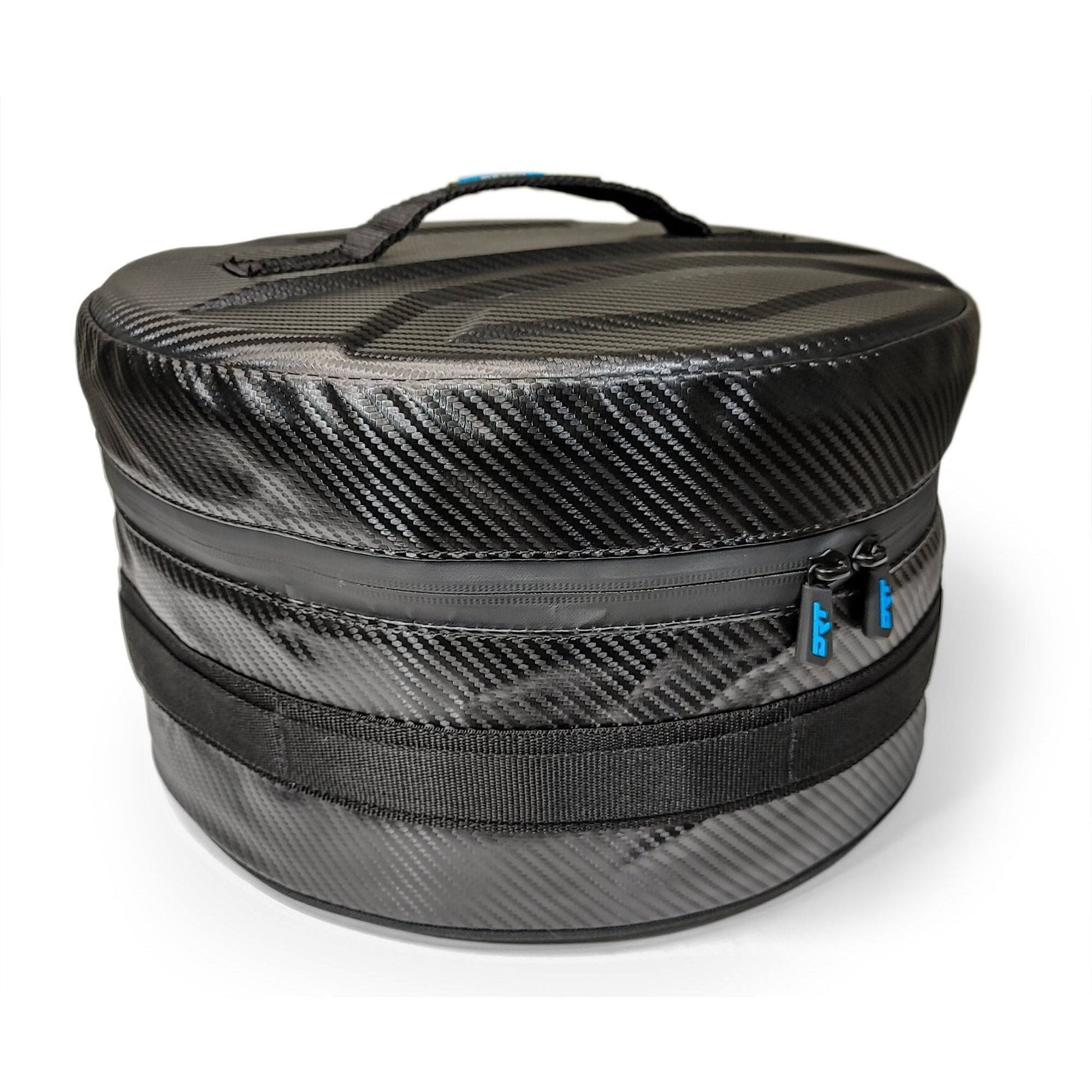 When used with DRT Tire Carrier/Adventure Rack the wheel is turned upside down to expose the wheel cylinder, and the bag is placed inside and held in place with the "Y" strap. This bag features a carbon fiber vinyl top with a durable nylon body to withstand the harsh elements of road adventures.