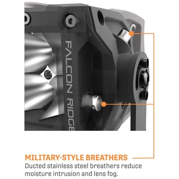 With industry leading features like IP68 rated housing, 304 Stainless Steel hardware, heavy-duty mounting brackets and shatter resistant lenses, the Falcon Ridge Summit Series LED lights are ready for whatever conditions arise. Falcon Ridge takes it to the next level with the Airstrike Intake and military-style breathers to help the lights maintain optimal operating temperatures. The IP67 rated backlit switch with solid aluminum housing fits standard knockouts, so it will seamlessly integrate into your dash control panel.