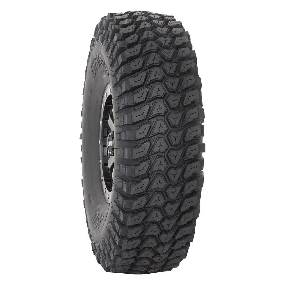 Multi-angle tread design has stepped structure for maximum bite.